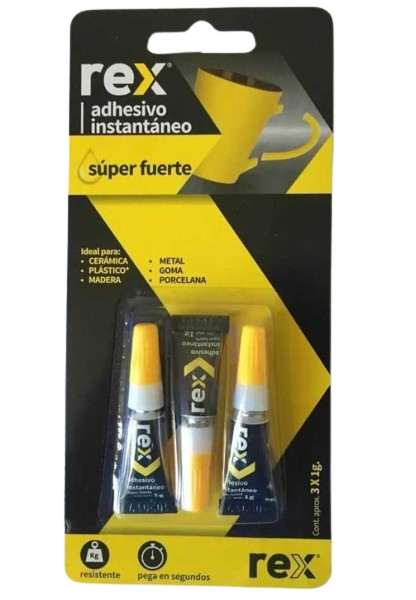 Rex Adhesivo instantáneo de 1gr, 3 pcs, Adhesivo de baja viscosidad, de uso general. Se adhiere a una amplia variedad de metales, plásticos, gomas, madera de porcelana, cuero y muchos otros materiales. Es un adhesivo a base de cianoacrilato desarrollado para aplicaciones que necesiten alta velocidad de curado y una excelente resistencia. El proceso de curado se inicia inmediatamente el adhesivo entra en contacto con la humedad del ambiente.