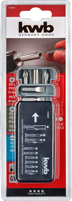 Juego de 9 piezas en práctica caja dispensadora. Contiene un soporte magnético con vástago E6.3 para atornillador de acumulador. Equipado con puntas de 25 y 50 mm de longitud en las dimensiones más habituales. Acero CV de alta calidad. Con vástago C6.3 / E6.3 de 1/4″. Superficie con acabado satinado