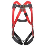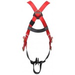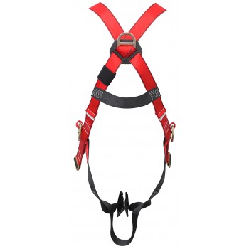 La cinta del arnés está diseñada de poliéster y presenta una deformación aproximada de 15%. Las costuras son hechas con hilo de Nylon de contraste para notar rápidamente cualquier desgaste de las mismas. Una argolla en la espalda y dos argollas en la cintura, utilizadas para amarrarse y permite así mantener las manos libres o para restringir la expo- sición a bordes donde existe riesgo de caída. Todas las argollas están hechas de acero forjado. Tanto las argollas como la cinta son probados con una resistencia mínima de ruptura de 22Kn (2.260 kg / 5.000 lbs). Ajustes por hebillas a fricción.