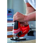 La caladora TE-JS 100 es un potente modelo para llevar a cabo trabajos exigentes de serrado en cualquier material. Su carrera pendular regulable en 4 posiciones y la regulación electrónica del número de carreras permiten trabajar el material de forma individualizada. El cambio de hoja de sierra sin necesidad de herramientas permite el uso de hojas de sierra con eje T y eje U, además de ahorrar un tiempo valioso. Con su suave empuñadura ergonómica, la TE-JS 100 se sujeta perfectamente en la mano. La sólida base de la sierra realizada en aluminio, también regulable sin necesidad de herramientas e igual de resistente, resalta las exigencias de la máquina en cuanto a la calidad y, además, se puede inclinar permitiendo ángulos de sesgado de hasta 45º. Su efectiva protección contra el desgarre de virutas garantiza una óptima calidad de la superficie. Con una luz LED integrada y una pantalla abatible transparente se mantiene en todo momento una buena y segura visión del material de trabajo, mientras que el tope paralelo permite serrar de manera controlada y precisa. Con la correspondiente hoja de sierra para madera se puede empezar el trabajo de inmediato. La función opcional de soplado de polvo, así como la posible aspiración de polvo mediante un adaptador garantizan orden y limpieza. En su práctico maletín de transporte y almacenamiento, se puede guardar la TE-JS 100 de manera ordenada y segura.