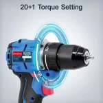 - Además esta equipado con un motor sin carbones de 20V, 2 velocidades y un torque máximo de 60Nm, garantiza potencia y durabilidad en cada perforación o atornillado.