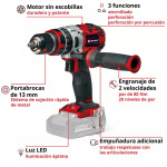El taladro percutor con batería TP-CD 18/80 Li-i BL-Solo Einhell Professional es el perfecto complemento en el taller de cada profesional del bricolaje. Como miembro de la familia Power X-Change, se puede utilizar cualquier cargador y batería de 18 V de la familia del sistema. El equipo se acciona por el motor sin escobillas PurePOWER de Einhell. Este motor sin escobillas ofrece más potencia y una vida útil más prolongada que los motores de escobillas de carbono convencionales. Tras un registro online se aplican 10 años de garantía en el motor sin escobillas. La función de perforación por percusión ayuda al artesano a trabajar con materiales rebeldes, como por ejemplo piedra u hormigón. Además, el taladro percutor tiene un engranaje de 2 velocidades para un atornillado potente y una perforación por percusión rápida con 8.000 golpes por minuto en la 1ª marcha y 28.800 golpes en la 2ª marcha. El acoplamiento deslizante evita un apriete excesivo de los tornillos. El par duro de 80 Nm se puede ajustar en 20 niveles de par. Con la ayuda de la electrónica de velocidad continua, se logra un trabajo adecuado a aplicación y material. La función de parada rápida y el portabrocas de sujeción rápida de metal de 13 mm monocasco con función de bloqueo permiten un cambio de herramienta rápido y fácil. Las articulaciones del usuario se cuidan por la empuñadura adicional. La luz LED ofrece también una buena visión de la zona de trabajo en caso de mala visión. Para un almacenamiento intermedio seguro, el taladro percutor se puede fijar al cinturón con el clip de cinturón. El envío se realiza sin batería ni cargador. Las baterías y los cargadores de la serie Power X-Change son adquiribles por separado.